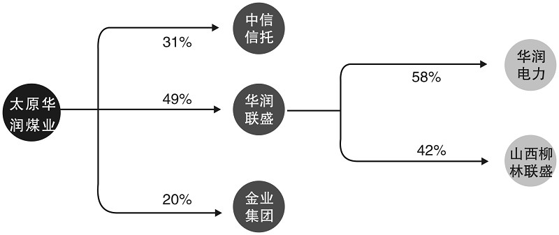 山西华润联盛投资有限公司于2009年6月11日成立,是华润电力和山西柳林联盛集团的合资公司,2010年5月11日,华润电力购买柳林联盛持有的华润联盛8%的股权后,华润电力与柳林联盛持有华润联盛的股权分别有58%和42%。2010年4月30日,太原华润煤业宣告成立——这是专为重组整合张新明的金业集团名下资产而成立的公司。华润联盛、中信信托和金业集团分别占有太原华润股权的49%、31%和20%,华润联盛和中信信托使用的是现金注入,金业集团以其被收购资产的20%作价入账,占8亿元的出资额。