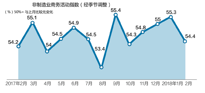 赵庆河在解读2月份综合PMI产出指数时指出,受春节因素影响,构成综合PMI产出指数的制造业生产指数和非制造业商务活动指数扩张势头有所减弱,分别为50.7%和54.4%,其中制造业波动较为明显。