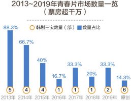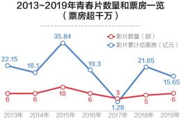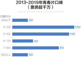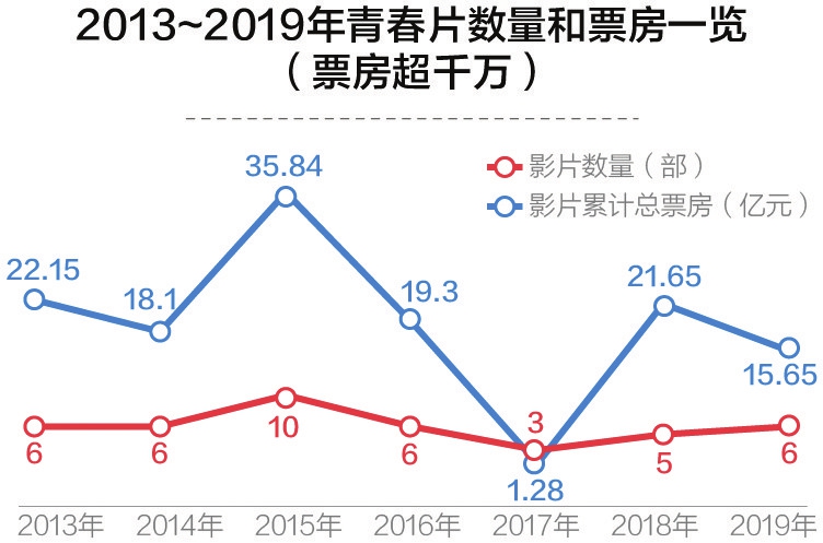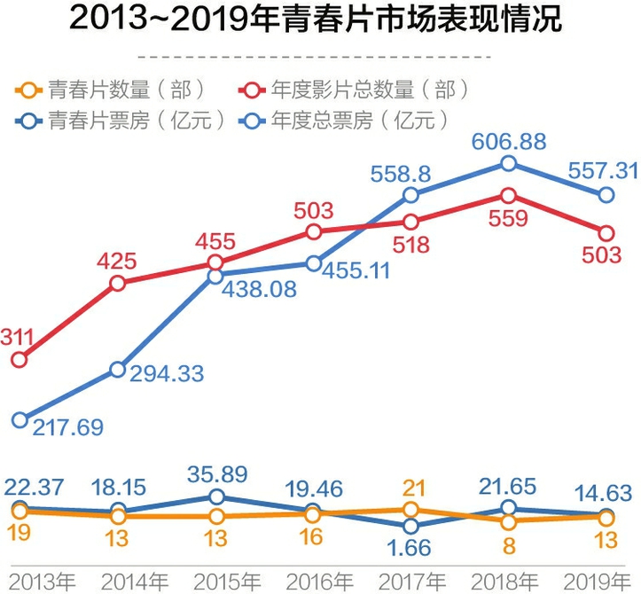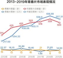 记者注意到,在过去的7年间,中国电影市场飞速发展,影片数量从2013年的300多部一跃增长到2019年的500多部,而能被称之为“青春片”的影片,只是每年300~500部中的十几部。2017年数量最多时的21部,在全年影片总数量中占比也仅仅4%。