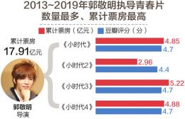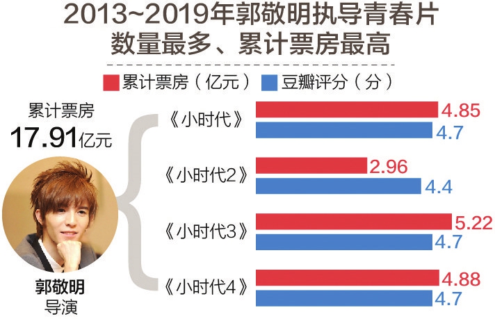 从导演的数量和累计票房情况来看,2013~2019年,郭敬明凭借“小时代”系列影片成为目前青春片电影中累计票房最高的导演,4部“小时代”影片累计票房近18亿元。不过在口碑方面,4部小时代系列影片豆瓣平均分为4.6分,均不及格。