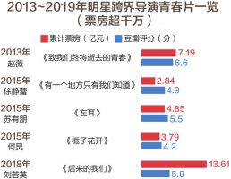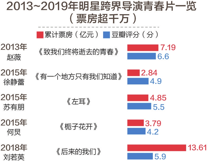 明星演员跨界导演,2013~2019年,最具有票房号召力的是刘若英执导的《后来的我们》,累计票房超13亿元;而在口碑方面,豆瓣评分最高的则为赵薇执导的《致我们终将逝去的青春》,豆瓣评分6.6分,徐静蕾、苏有朋和何炅等执导的影片,口碑均不及格。