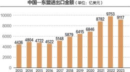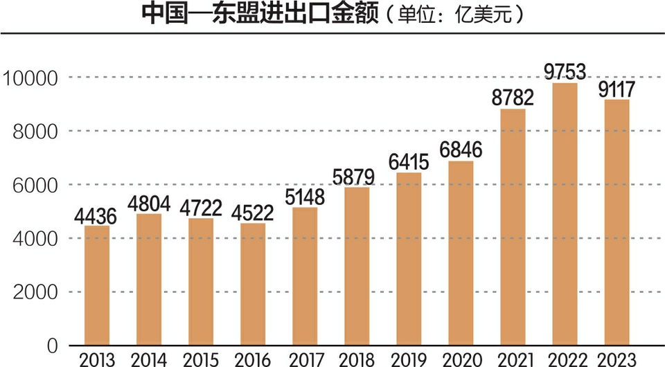 海关总署数据显示,2023年,中国与东盟贸易规模达6.41万亿元,占中国外贸总值的15.4%,连续4年保持中国第一大贸易伙伴地位。今年前三季度,中国与东盟贸易总额达到5.09万亿元,同比增长9.4%,较全国整体水平高出4.1个百分点。