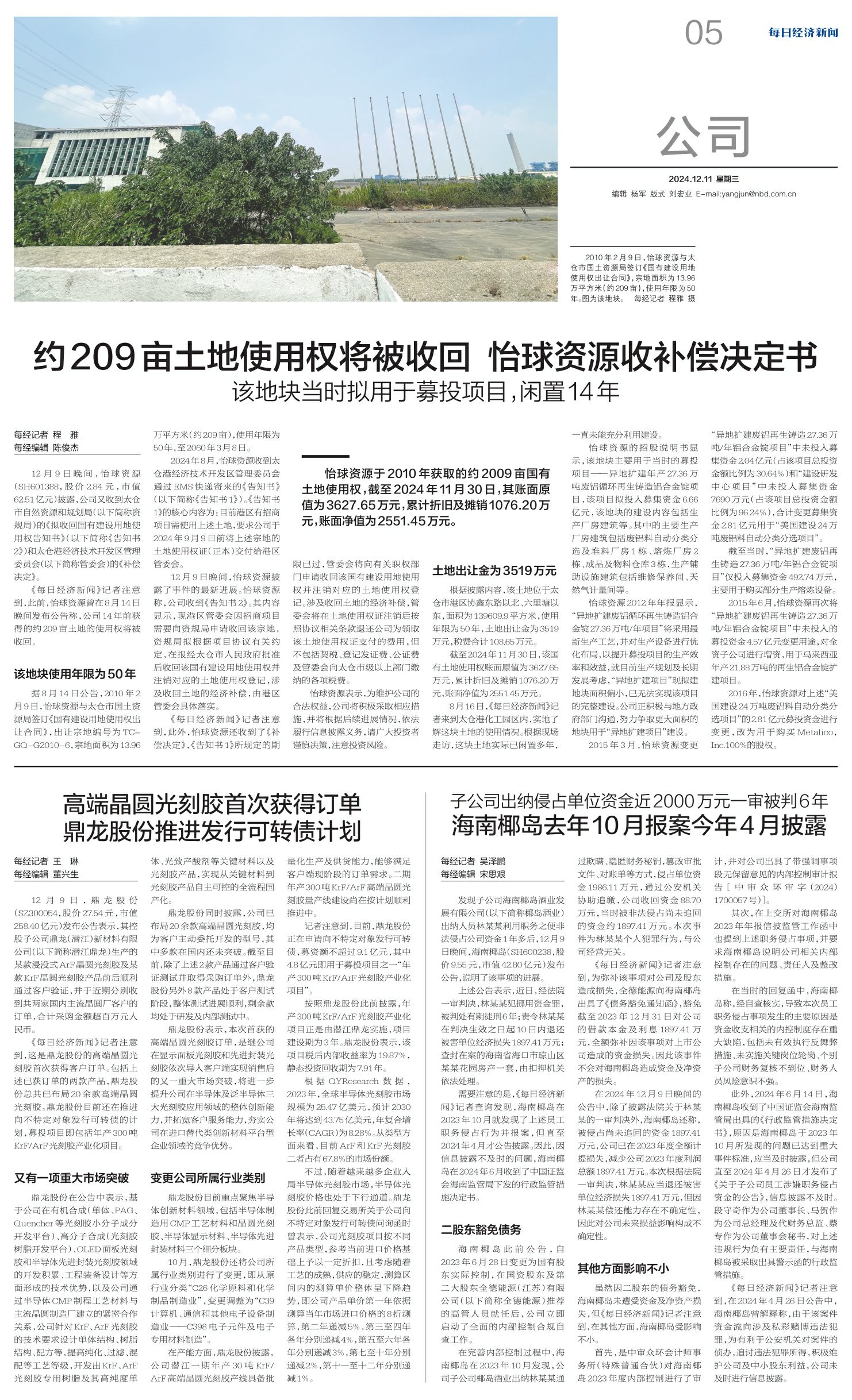 约209亩土地使用权将被收回 怡球资源收补偿决定书
