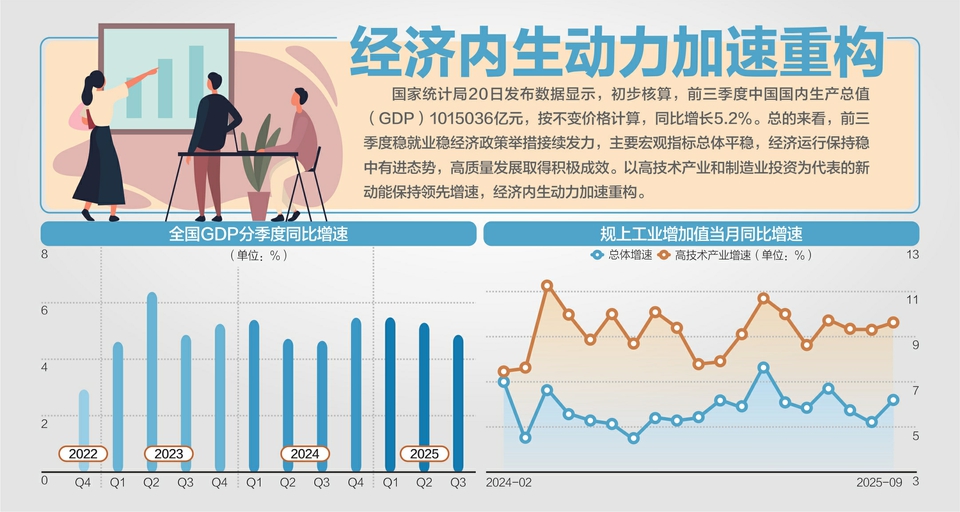 东方金诚首席宏观分析师王青接受《每日经济新闻》记者微信采访时进一步分析,整体上看,前三季度面临外部经贸环境剧烈波动带来的重大冲击,宏观经济延续去年四季度以来的偏强增长态势,经济增速达到5.2%,高于年初制定的“5.0%左右”的增长目标,代表新质生产力发展的高技术制造业等领域保持较快增长。背后是外贸企业积极应对外部波动,出口增速不降反升,国内稳增长政策发力显效,内需对经济增长的拉动力增强。