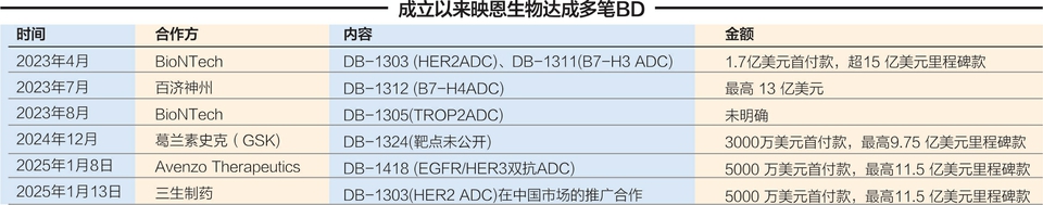 借助这一模式,在登陆资本市场前,映恩生物已经收获6笔BD,合作伙伴包括BioNTech、百济神州、GSK等知名药企,这在国内Biotech里,称得上是种子选手。