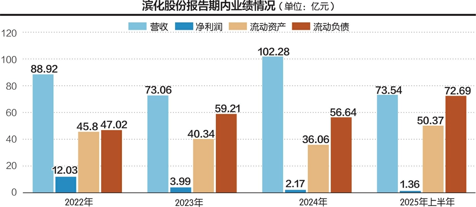 《每日经济新闻》记者注意到,报告期内,滨化股份的流动资产均小于流动负债,即流动比率小于1。具体来看,报告期内公司的流动资产分别为45.8亿元、40.34亿元、36.06亿元和50.37亿元,而同期,公司的流动负债分别为47.02亿元、59.21亿元、56.64亿元和72.69亿元,均高于同期的流动资产。