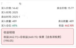 例如,当天投保的是某科技股,买入价格为14.42元/股,卖出价格为15.77元/股,用户交易数量489股,收益就是462.11元,即总收益660.15元减去保费198.05元。