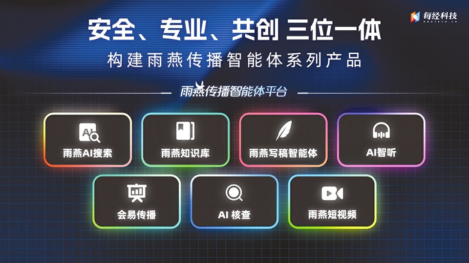 值得关注的是,每经科技的研发步伐正在加速。11月27日,在“2025智媒体50人成都会议”上,每经科技面向行业推出雨燕传播智能体平台系列产品,核心功能包括权威信源AI搜索、垂类知识库和写稿共创智能体等。通过“安全、专业、人机共创”的产品理念,每经科技正构建内容生产传播的全链路可信AI体系。