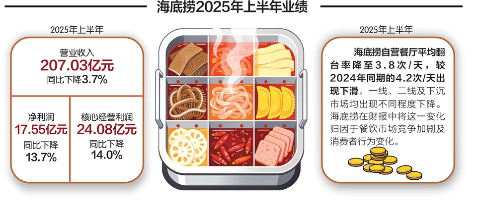 财务数据显示,2025年上半年,海底捞实现营业收入207.03亿元,同比下降3.7%;净利润17.55亿元,同比下降13.7%;核心经营利润为24.08亿元,同比下降14.0%。