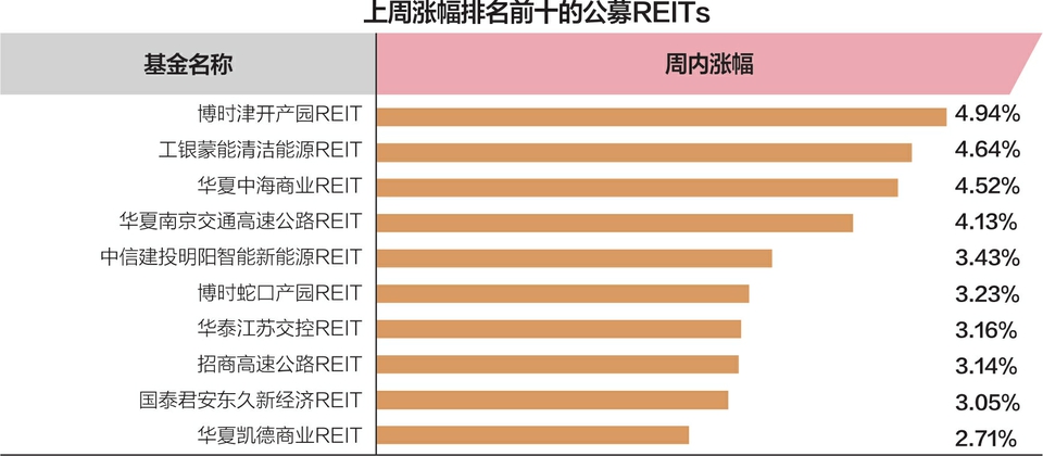 来自国泰海通证券的数据显示,从底层资产来看,过去一周各板块涨跌幅分化,其中能源和市政环保类REITs涨幅居前。