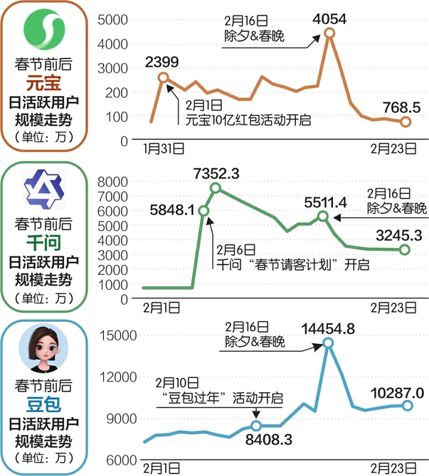 活动期间,豆包、千问、元宝三大AI应用均创各自的日活新高,峰值分别为1.45亿、7352万、4054万。除夕当日,豆包、千问、元宝日活总和超2.4亿。