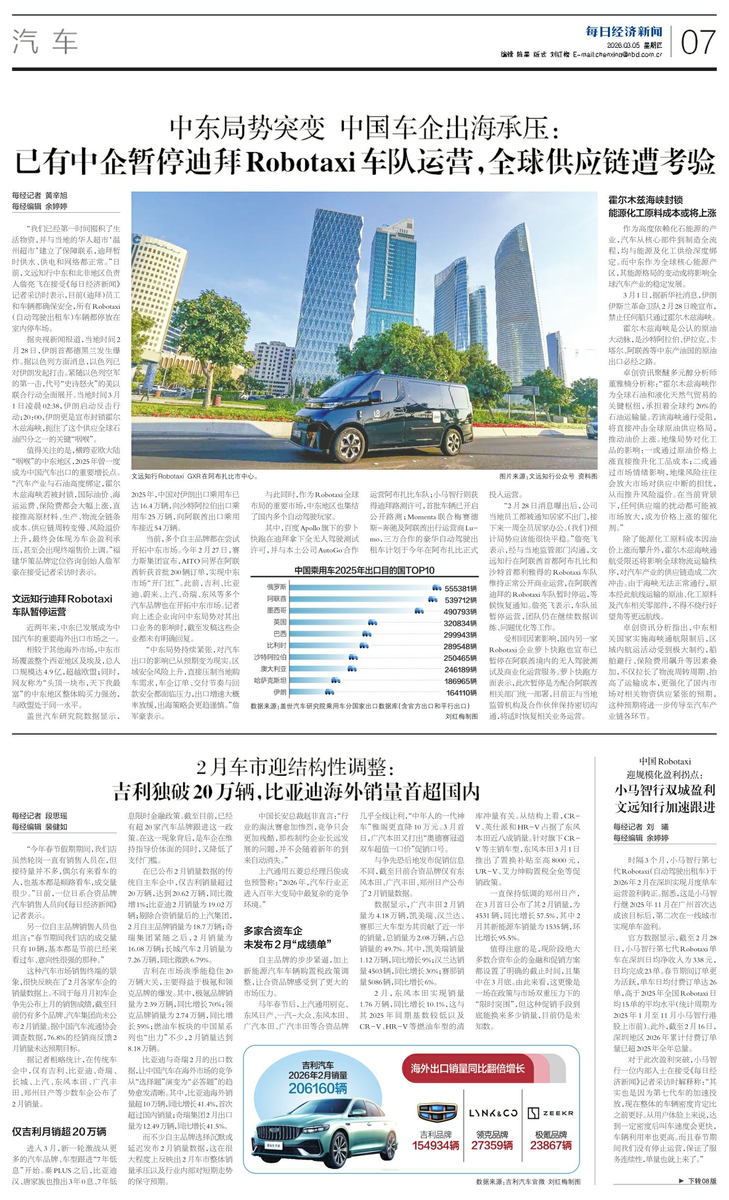 中东局势突变 中国车企出海承压:已有中企暂停迪拜Robotaxi车队运营,全球供应链遭考验