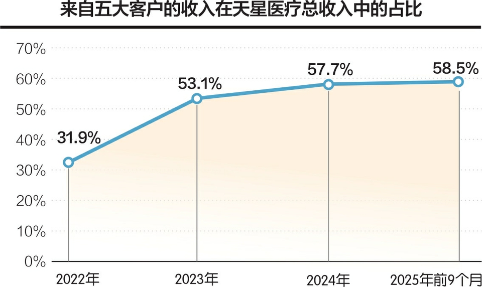 除专利诉讼外,招股书还披露了其他几项值得关注的数据。客户集中度方面,2022年、2023年、2024年及2025年前9个月,来自五大客户的收入分别占天星医疗总收入的31.9%、53.1%、57.7%及58.5%。其中,2025年前9个月最大客户贡献收入5290万元,占比19.4%,若主要客户流失或采购量下降,可能对经营业绩造成不利影响。