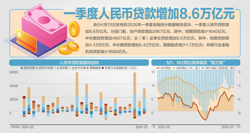 4月13日,央行披露最新一期金融统计数据。初步统计,2026年3月末社会融资规模存量为456.46万亿元,同比增长7.9%。其中,对实体经济发放的人民币贷款余额277.3万亿元,同比增长5.8%;企业债券余额35.16万亿元,同比增长7.9%;政府债券余额98.47万亿元,同比增长15.9%。