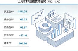 具体规模变动方面,上周股票型ETF和跨境ETF分别增长1154.25亿元和205.96亿元,实现较大“回血”。此外,债券型ETF和商品型ETF分别增长69.33亿元和56.67亿元;在权益资金虹吸效应下,货币型ETF缩水27.16亿元。